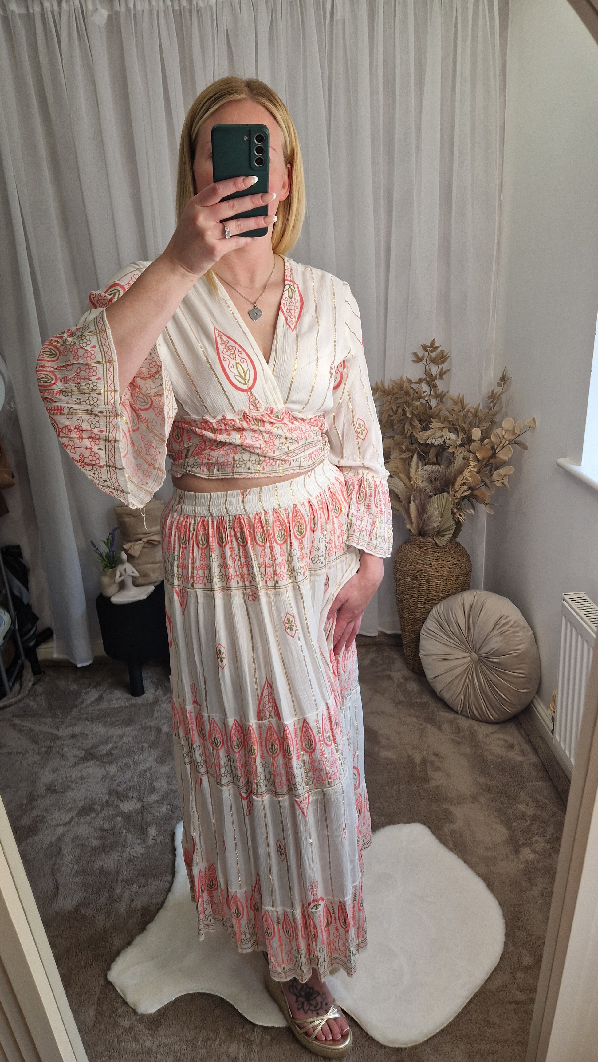 A stunning 2-piece set featuring a tie-front crop top and a flowing full-length skirt, designed with a Spanish-inspired flair. The bold pink & gold teardrop design adds a vibrant, eye-catching touch, while the dramatic silhouette creates movement and elegance. Perfect for making a statement at summer parties or holiday evenings.